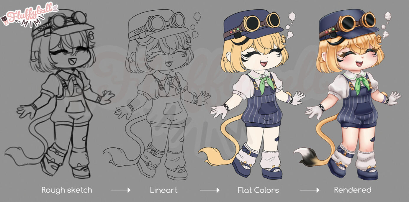 Here's an example of the 4 general updates you will receive when commissioning me! After the approval of the rough sketch and payment, I move onto lineart, then flat colors, then rendering! Revisions during the sketch phase are free, but afterwards the cost increases depending on the request! If you have any questions, feel free to reach out!